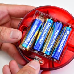 直径φ 93mm・高さ40mmで、ボディは樹脂製。防水性は特に記載されていないが、合わせ部分にはOリングを使用する。●寸法:直径93mm 高さ40mm ●電源:単3電池4本 ●価格:2200円