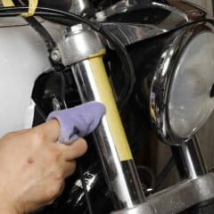 フロントフォークのインナーチューブやリアショックのロッドが錆びるとリペア作業もコストも大変。僅かな点サビも発見次第除去しよう。デカキングはメッキに傷を付けないので、サスに影響を与えない。