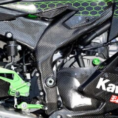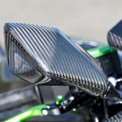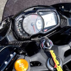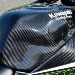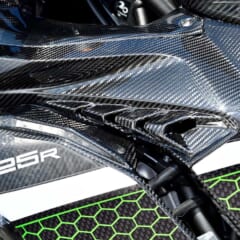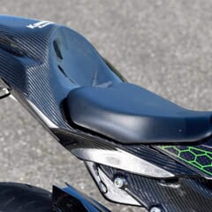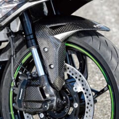 【エーテック ZX-25R ストリート用フルカウルSTD4点セット】アッパー/左右サイドカウル/アンダーカウルの4点セット。カーボン素材は一般的な平織/綾織のほか、ドライカーボンケブラーや"開繊"と名付けた超強度のドライカーボンFRPの4タイプから選べる。その他にFRP製もあり。スクリーンは別途エーテック製(1万7600円~)が必要。ヘッドライト/ミラー/ウインカー/マフラーは純正が装着可能だ。●価格:綾織/平織カーボン27万5000円 ドライカーボンケブラー/開繊ドライカーボン33万円 黒ゲル/白ゲルFRP11万円
