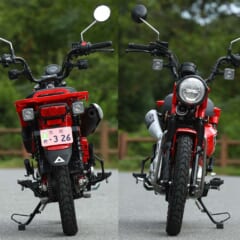 【'20 HONDA CT125 HUNTER CUB】主要諸元■全長1960 全幅805 全高1085 軸距1255 シート高800(各mm) 車重120kg ■空冷4スト単気筒OHC4バルブ124cc 最高出力8.8ps/7000rpm 最大トルク1.1kg-m/4500rpm 4段リターン(停車時のみロータリー式) 燃料タンク容量5.3L ■タイヤサイズF=80/90-17 R=80/90-17 ●色:グローイングレッド マットフレスコブラウン ●価格:44万円