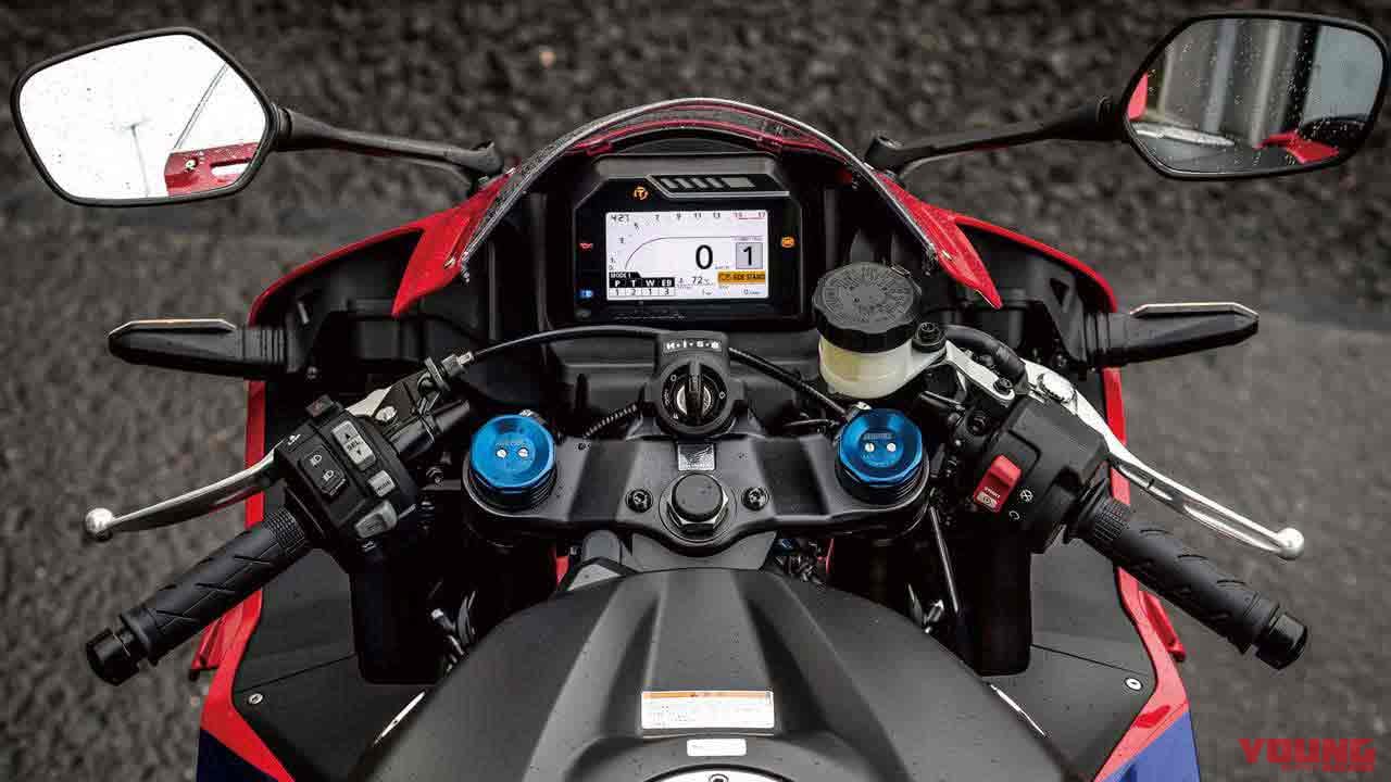 【現代流コクピットも獲得】国産600ccスーパースポーツ唯一のフル液晶メーターを採用。フロントフォークは設定変更のほか、20mm延長して車高調整幅を拡大し、アウターチューブ変更で剛性バランスを改良。燃料タンクは伏せやすいよう上面を10mm下げ、アゴも収めやすい形状に。