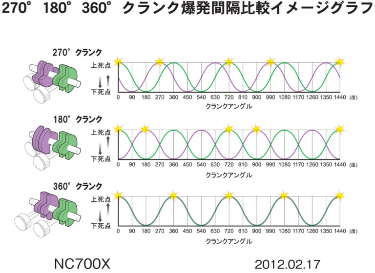 現在は2気筒らしい鼓動感を主眼として、多くの並列2気筒エンジンに270度位相クランクが採用されている。