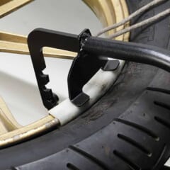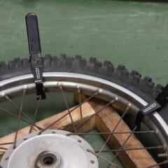 オンロード車用のビードキーパー(デイトナ製)を使って、チューブ入りキャストホイールのタイヤを抜き取った。スタンダードタイプのビードブレーカーでビートを落とし、付属品でリムの振れ確認も行ってみた。