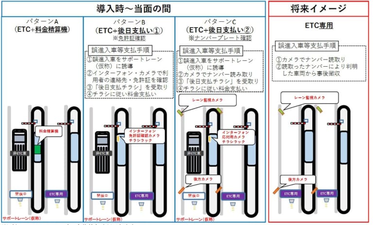 問題はETC非採用車の場合だが、当面はサポートレーン(仮称)での料金精算や、インターホンやカメラで免許証確認もしくはナンバープレートの読み取りを行い、後日支払いの処理を検討。将来的にETC専用化が実現すればサポートレーンも撤去し、未払い車両は事後徴収が考えられている。