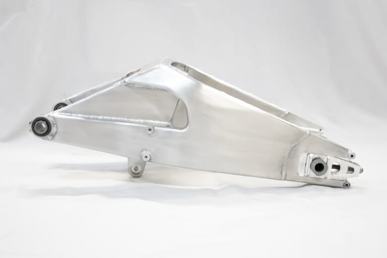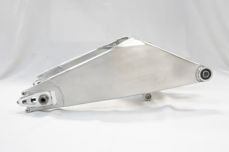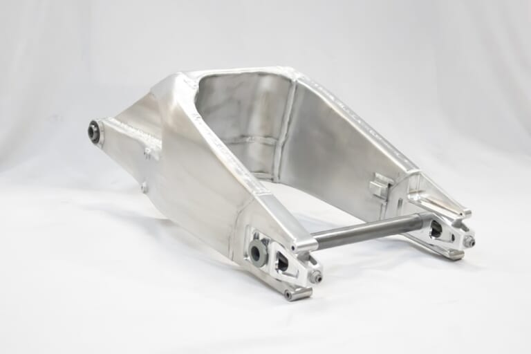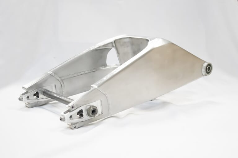 今回紹介するのは、400km/hへの挑戦やテイストオブツクバでのレース参戦のデータを参考に、純正スイングアームの片持ちを両持ちスタイルへと変更した、ニンジャH2/ニンジャH2R用のオリジナルスイングアームだ。メイン部はアルミプレスを成形したもので、アクスルボックスは削り出し製作。材質はA7N01を使用しており、純正足まわりがユニット重量約19.9kgであるのに対し、約3.7kgの軽量化でバネ下重量を軽減し、運動性能の向上を図っている。