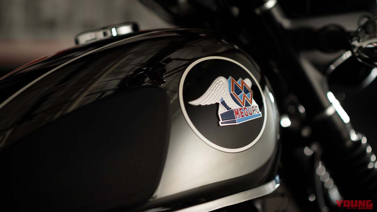 極めつけはメグロエンブレム。職人が5色を手塗りし、実に精緻な出来映えだ。さらにシートはフラットな形状の白パイピング入りとし、リヤサスペンションにカバーをあしらうなど、クラシック感を増す専用パーツも忘れない。