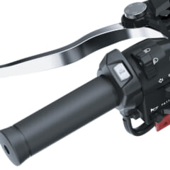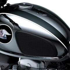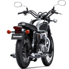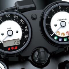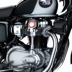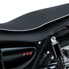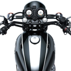 【ハンドルはアップライトスタイル】フラットなW800のハンドルに対し、高めかつ絞りの利いた同ストリートのハンドルで、K2らしい殿様ポジションに。メーターには赤い“メグロ”ロゴ、タンクには空が映し出され、気分は上々!