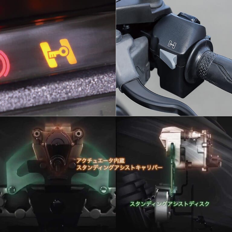 パラレログラムリンク上部アームにある専用キャリパーを作動させ、車体の傾きを抑えるのがスタンディングアシストだ。10km/h&2000rpm以下、スロットル全閉時にのみ操作可。