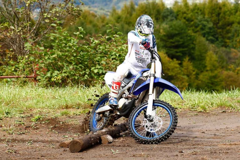 エンデューロのいちセクションとして、かなり浸透した感のある”丸太”。何本も積み重ねたモノもあれば、今回登場する小さめの丸太のように単独で置かれているセクション、さらに小さめの丸太が何本も続くようなセクションなど、コースによって表情はさまざまだ。