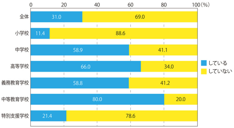設問「体育科または保健体育科の授業の中で児童生徒を対象に心肺蘇生とAED使用(模擬人形や模擬AEDを含む)の実施を伴う指導をしていますか」への回答 ※出展:「心肺蘇生の実践とAEDの活用 ~児童生徒の心臓突然死ゼロを目指して~」(公益財団法人日本学校保健会)平成31年2月20日発行