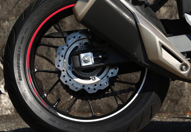 【ブレーキ&サスペンション】[左]フロントフォークは動きのよい正立式で、ナチュラルなハンドリング。Φ320mmウェーブタイプシングルディスクはABSを装備している。[右]リヤサスペンションは分離加圧式シングルチューブタイプ。乗り心地がよい一方でしっかり踏ん張ってくれるのは、このリヤサスペンションの恩恵だ。