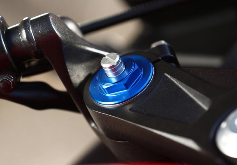 【プリロード調整機構】フロントフォークはプリロード調整機構を備え、好みに応じてセッティングが楽しめる。ブルーアルマイトのフォークキャップがアクセントに。