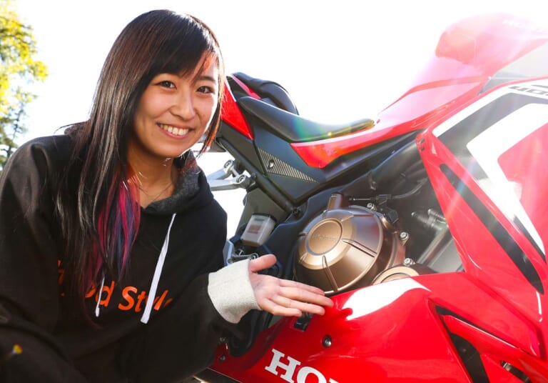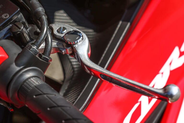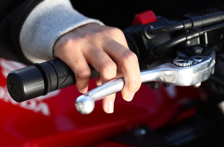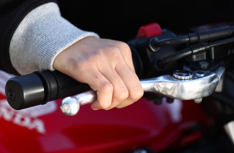 岡崎「ここでちょっとしたサーキットライテクを。最近はブレーキレバーを中指で握るようにしています。人差し指と薬指をレバーにあてがうことで、より精密なコントロールがしやすくなるから。自分はまだまだ練習中ですが、サーキットで速く走るためには重要なポイントになりそうです」[左]サーキット限定 [右]公道ではしっかり止まる