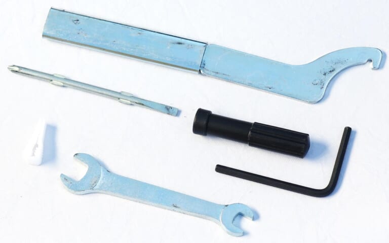 シート下スペースには車載工具が。リヤサスペンションの調整に使うフックレンチも。