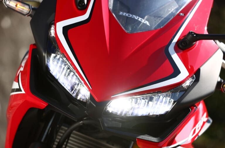 【LEDヘッドライト】CBRらしさをアピールするデュアルヘッドライトはLEDを採用。HI/LOWとも両側点灯式だ。