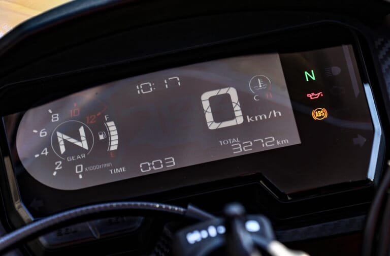 【フルデジタルメーター】ギヤポジションを表示し、シフトアップインジケーターも備えているフルデジタルメーター。