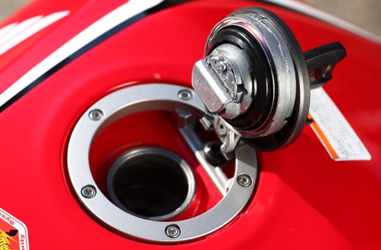 【燃料タンクキャップ】給油時に便利なヒンジ式。燃料タンク容量は17Lあって、ロングツーリングでも安心だ。