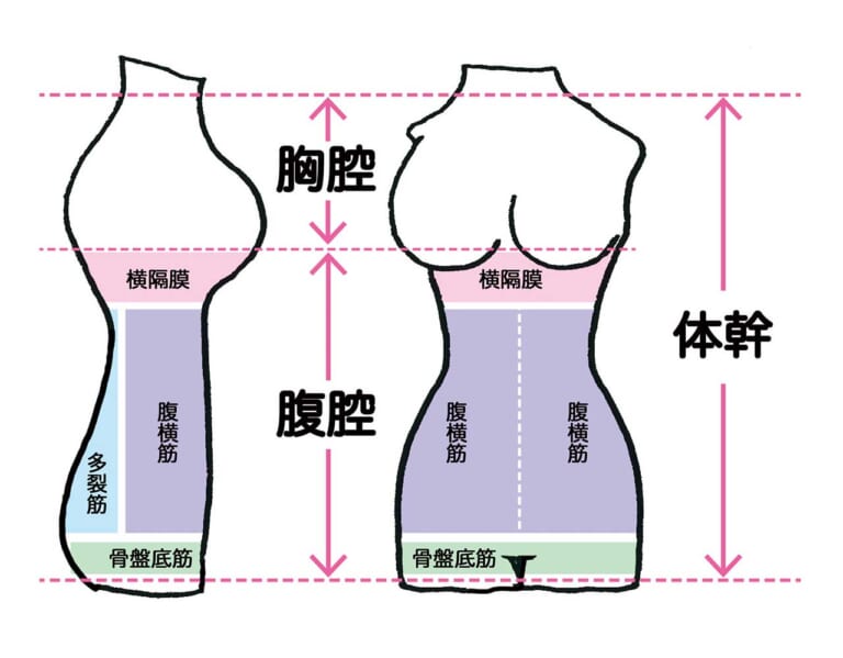 体幹は胸腔と腹腔に分かれ、この腹腔を構成し腹圧を高める役割を持つのが、ローカル筋(インナーマッスル)に属する横隔膜筋/多裂筋/腹横筋/骨盤底筋。この4つを「インナーユニット」という。
