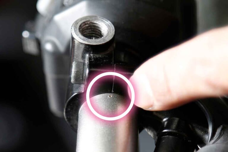 クラッチレバーの高さ基準については、こっそりポンチ(基準を教えてくれる穴)がハンドルバーに刻まれている。高さを元の位置に戻したい時は、レバーホルダーの結合部の線にポンチを合わせればOK。また2カ所のボルトを緩めすぎてレバーホルダーをガタガタにしてしまった時もココに合わせれば元通りだ。