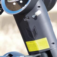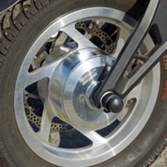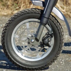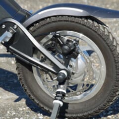 【前後にディスクブレーキを採用】リヤはリジットだが、フロントにはサスペンションを搭載。リヤブレーキはクイックに効くのでタイヤロックしやすいが、フロントブレーキはじんわり効いてロックしにくく制動性能も高い。