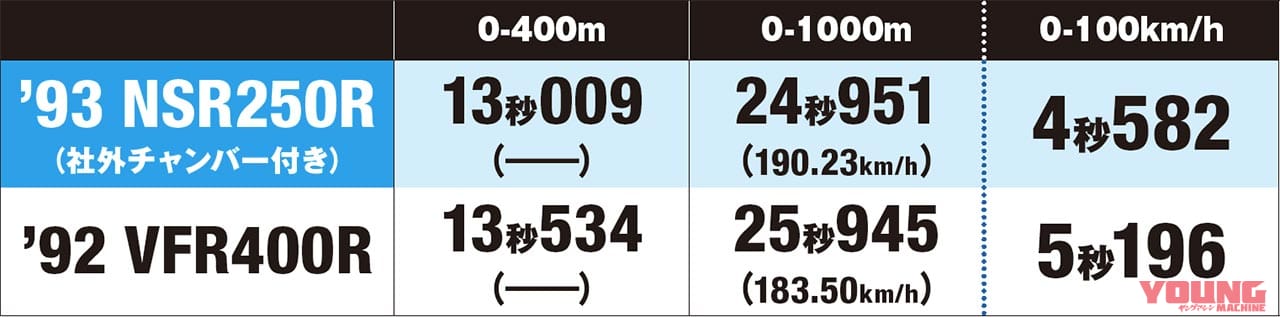 100km/hまでの到達時間でも約1秒の差があり、もはや同じマシンとは思えない変貌ぶりだ。しかも、到達スピードを見れば分かるとおり、200km/hの実力があるフルチューン仕様には0-1000mの距離だとまだ余力が残っている。エンジン内部も強化すれば…。これはもう底が知れない!