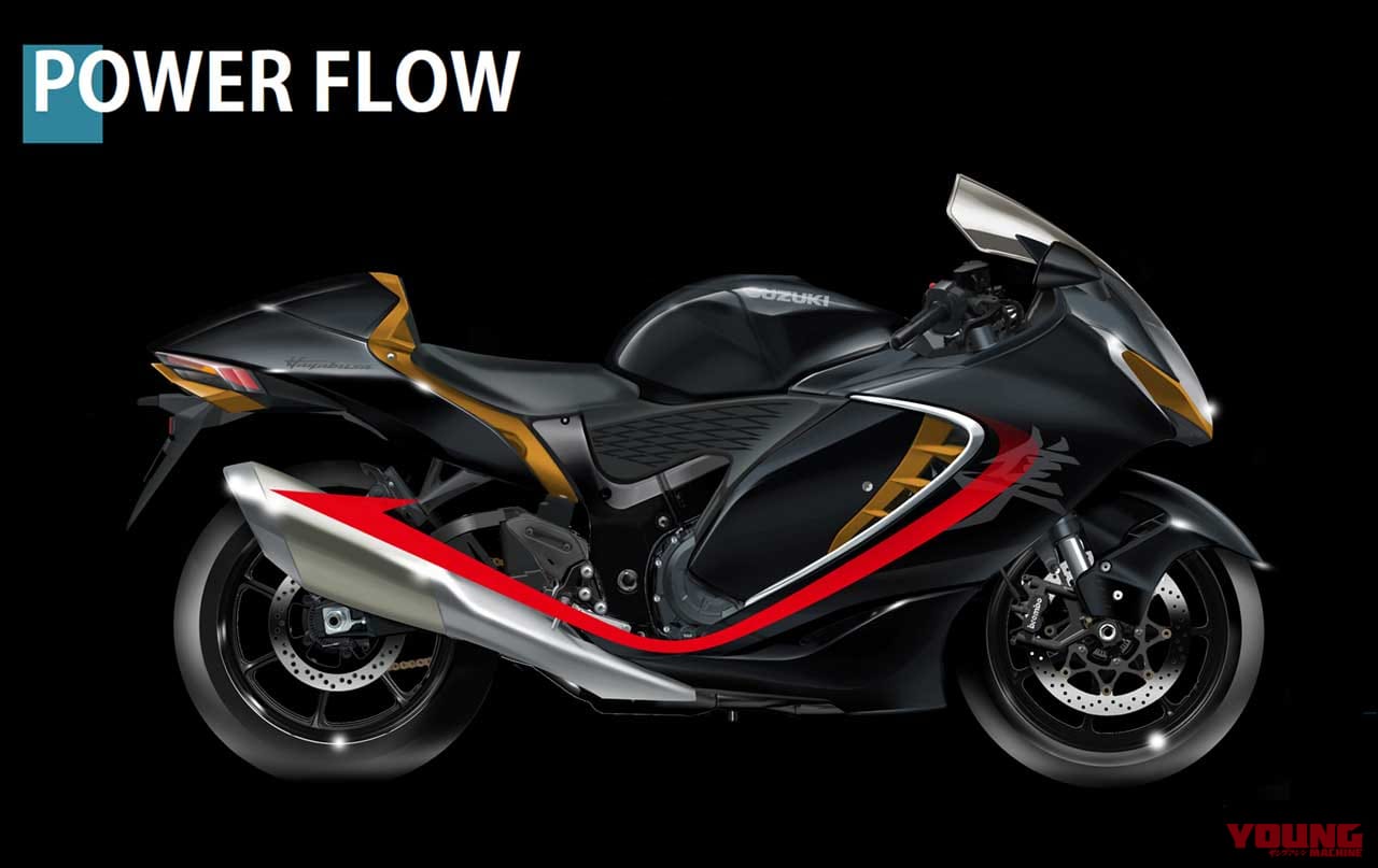 【速さを連想させる工夫が随所に】ストレートに伸び、エンド部も鋭い角度を描くマフラーは軽快感抜群。サイドカバーのV字スリットは、隼の首まわりの毛をイメージしており、後方への風の流れを表す。