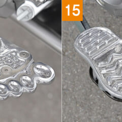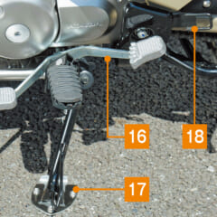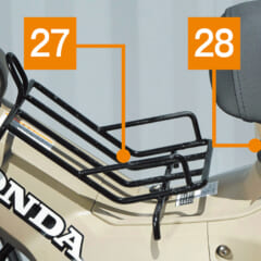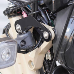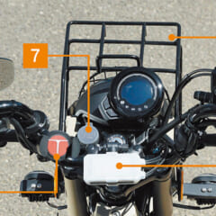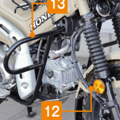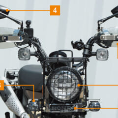 【1.HONDA純正エンブレムステー】ホンダ純正エンブレム(3960円)を装着するためのステー。●価格:2200円【2.ヘッドライトガード】飛び石などからヘッドライトを守り、タフなイメージを高めてくれる。●価格:9350円【3.フォグランプキット】夜間走行時の視界を広げるLEDフォグランプをCT125用にフィット。●価格:3万3000円【4.TECH03ミラー】軽量なアルミ製フレキシブルステーを採用したバックミラー。●価格:各6270円【5.ハンドルガード】軽さと強度を兼ね備えたポリカーボネート製。●価格:6270円
