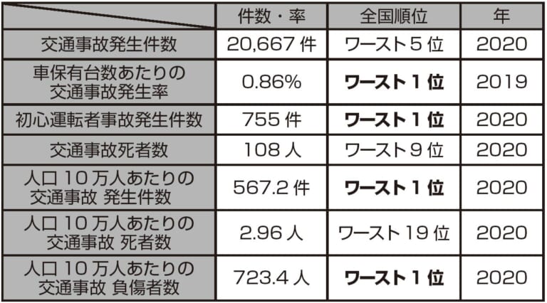【静岡県の交通事故状況】静岡県の交通事故状況を見てみると、ワーストランキングの上位にあたる項目が多い。交通事故は車の保有台数に左右される側面があるため、一般的には「車保有台数あたりの交通事故発生率」が交通事故状況の目安とされるが、’19年はワースト1位だった。また、指定教習所から必ず公表されている初心運転者事故発生件数もワースト1位(’20)であり、群馬県とワースト争いをしている状況にある。
