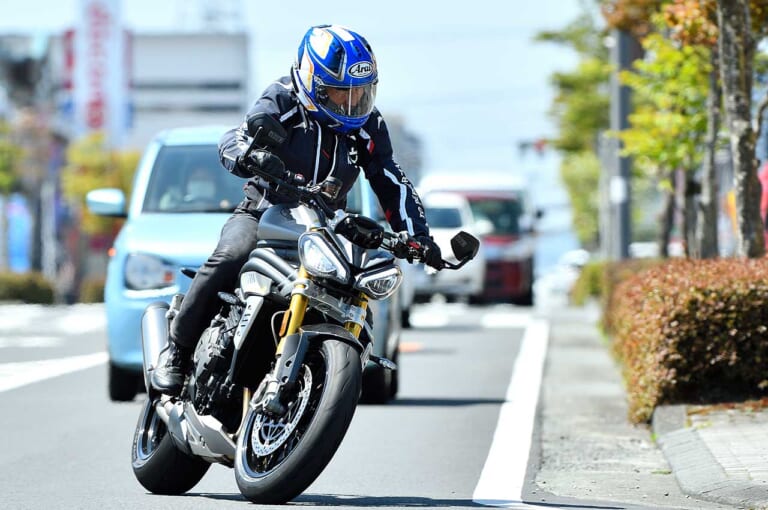 市街地走行などでは、3000~4000回転でも十分に力を感じられ、その領域だけ使っていても普通に走れる。5000回転から先で車体姿勢がドタバタし始めるので、その片鱗を垣間見たところでシフトアップ……というのが、公道では一番気持ちいい。サウンドやバイブレーションも魅力的。排気量が1200ccに迫る3気筒なので特定回転域では振動が多めに発生するのだが、その質が回転とともに移り変わり、むずがゆくなるようなものでもないため、振動すらも乗り味のひとつとして楽しめてしまう。クイックシフターはソフトなタッチだが、アップ側にややタイムラグがあり、市街地で乗っているとそこに穏やかなフィーリングすら感じてしまう。
