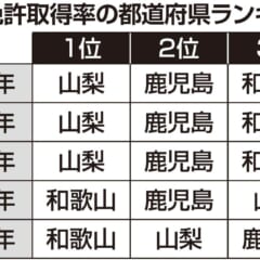 生産年齢人口(15〜64歳)1万人当たりの原付免許取得者数を「原付免許取得率」として計算。山梨県は、過去5年で3回トップに立っている。運転免許試験場に加え警察署でも受験でき、高校生の原付通学が盛んなことなどが、取得率を押し上げていると言える。