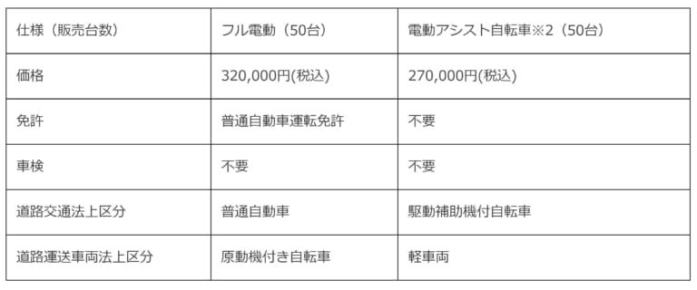 フル電動タイプのほうがバッテリー容量の拡大などから車重はやや重い。とはいえたったの31kgだ。後続距離はそれぞれのタイプで異なり、家庭用AC100Vのコンセントで充電できる。フル電動タイプの登録は、いわゆるミニカー(水色ナンバー)だ。