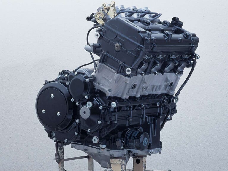 GSX-R750の設計思想を受け継いだ心臓部。設計はオーソドックスで、28度のバルブ挟み角やTSCC燃焼室でコンパクトさを追求した。主要3軸は直線配置とし、1軸2次バランサーを装備。馬力と排気量は、確実に実測300km/hを出すために導き出された。