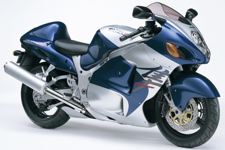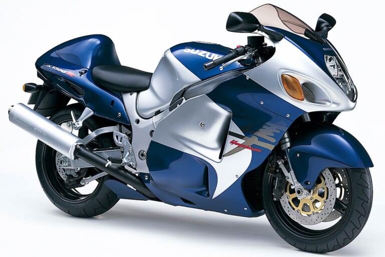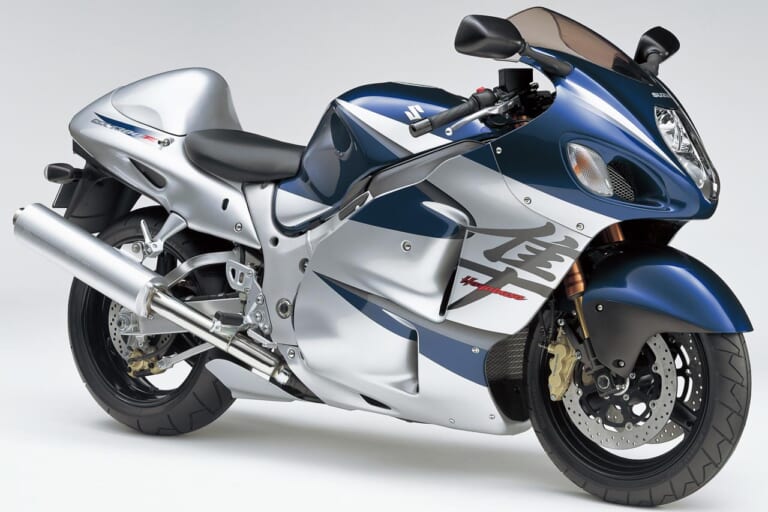 “アルティメット(究極)スポーツ”をコンセプトに掲げ、「GSX1300R HAYABUSA」として登場した初代ハヤブサ。当時の直4最大となる1299ccを誇り、史上最強の175psをマークした。基本設計は、当時のスーパースポーツであるGSX-R750を煮詰めた王道の手法で性能を追求している。一方、斬新だったのが曲面を多用した前代未聞のエアロボディ。この空力特性とデザイン性を両立したカウルが市販車初の300km/h超に大きく貢献した。やがて実力が知れ渡り、人気車の地位を確立する。