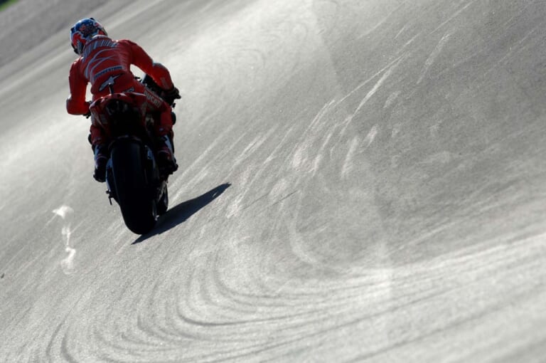 来季に向けたタイヤに関するゴタゴタは、解決するどころかさらに問題が増えているような状況でしたが、ストーナー選手の好調はなおも続き、サンマリノGPの2週間後に開催された第14戦ポルトガルGPでも、優勝をロッシ選手、2位をホンダワークスのダニ・ペドロサ選手に譲ったものの、ロッシ選手と約1.5秒差の3位に入賞。ストーナー選手は2番手ロッシ選手と83点差のランキングトップで次戦の日本GPを迎えることになり、シリーズタイトルにリーチをかけることになりました。