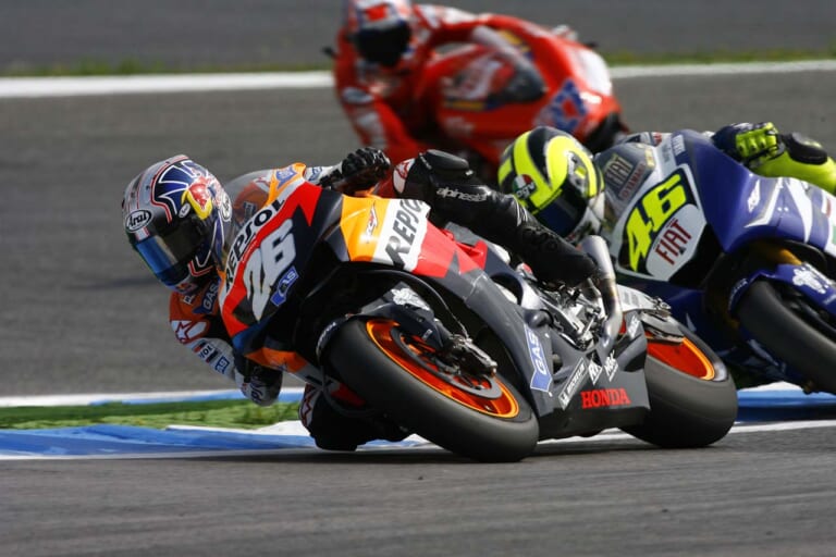 勢いを増す若手だったペドロサ選手と、王様ロッシ選手。ストーナー選手は総合チャンピオンを見据えて、やや距離を置く?