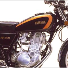 【'78 YAMAHA SR400[2H6]/500[2J3]】■全長2105 全幅765[845] 全高1135[1155] 軸距1410 シート高810(各mm) 車重158kg(乾) ■空冷4スト単気筒SOHC 2バルブ 399cc[499cc] 87×67.2mm[87×84mm] 27ps/7000rpm[32ps/6500rpm] 3kg-m/6500rpm[3.7kg-m/5400rpm] 変速機5段 燃料タンク容量12L ■タイヤサイズF=3.50-19/R=4.00-18 ●価格:31万円[35万円] ※[ ]内は500 ※写真の車体色はブラックゴールド(共通色)