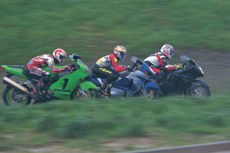 [1] スズキ GSX1300R ハヤブサ(写真中央)’00モデルではカラーチェンジのみ実施。最高速重視の設定のためか、防風効果は12Rより低め。頭部や体に当たる風量が大きく、速度無制限での長距離ランはややシンドイ。