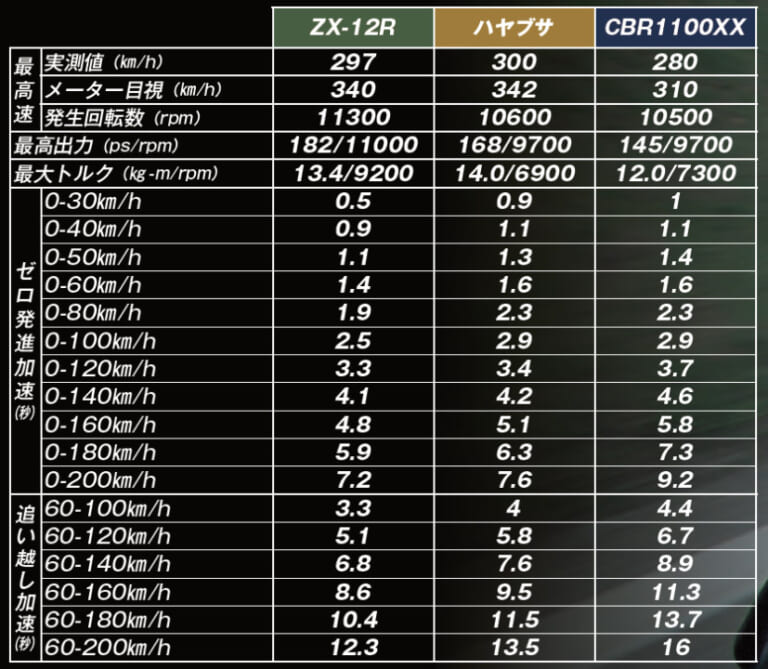 加速タイムはZX-12Rが圧倒も、最高速はハヤブサが上回る