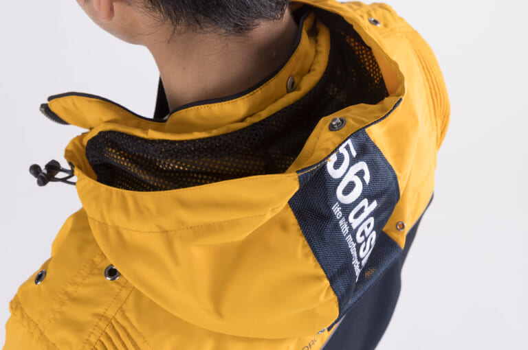 フードはホックで留められるようになっているほか、中心部分をメッシュにしてバタ付きを軽減。またファスナーで簡単に着脱可能だ。