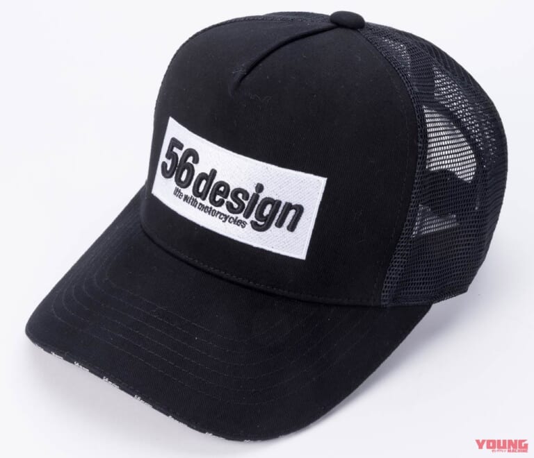56デザインのロゴを正面に大きくあしらったメッシュキャップ。バイクを降りた時に、真夏の太陽から涼しく快適に頭を守ってくれる。