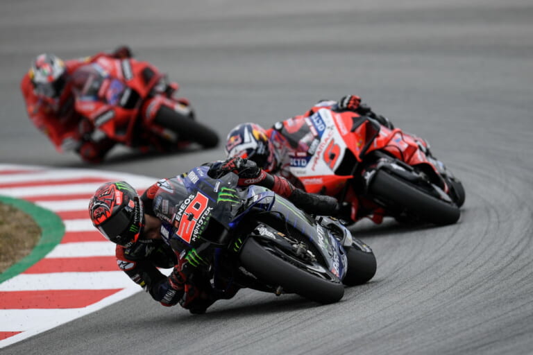 逆にクアルタラロとしては、ストレートスピードが伸びないヤマハのマシンで勝つには、何としても序盤から前に出るしかありません。他車とのバトルに巻き込まれると走りのリズムが崩れ、タイヤも痛めてしまいます。そうなると今のヤマハに勝機はないでしょう。どうにか前に出たいクアルタラロ。何としても押さえ込みたいバニャイヤ。お互いの勝ちパターンが分かっている者同士がスタート直後に見せた、高度な駆け引きでした。
