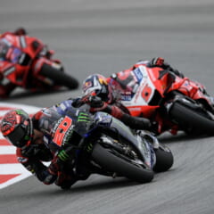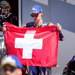 MotoGP第6戦イタリアGP。勝利したファビオ・クアルタラロ選手はジェイソン・デュパスキエ選手を追悼しスイス国旗を手にする。