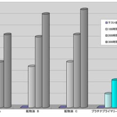 鉱物油や半合成油と100%化学合成油を使用した場合の摩耗を比較したグラフ。数字が低いほどチェーンの摩耗が少ない。