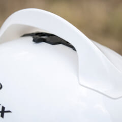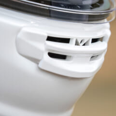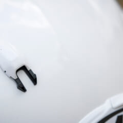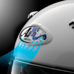 【アライ初の前頭部エアインテークを投入】アライでは初めて額にベンチレーションを採用。アライのロゴ下部にエアインテークがあり、内部の2孔から帽体内に走行風を送り込む。スイッチは上げた状態がオフだ。一般的なシャッターより見た目にスマートなのもいい。