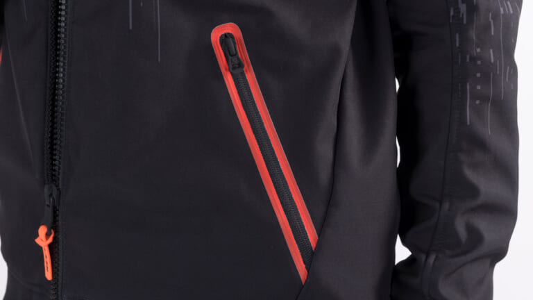 表面はポリウレタンを配合した動きやすいソフトシェルタイプ。前面ポケットは止水ファスナーを使用しており、雨の浸入を防いでくれる。