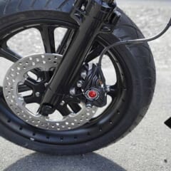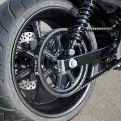 スパルタンな黒一色で統一されているものの、卓越したディテールワークによって決して地味な印象を与えないこのマシン。やはりリアタイヤのサイズが迫力を醸す。