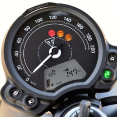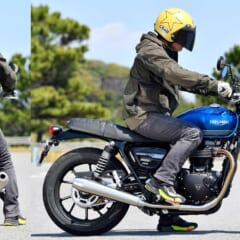 【ライディングポジション&足着き性】シート高は765mmと低く、シートもスリムなので両足の踵までベッタリと着いて、なおかつ膝にも余裕がある。上半身はほぼ背中が垂直になるアップライトなものでとても楽。1日中走っても疲れにくそうだ。[身長172cm/体重75kg]