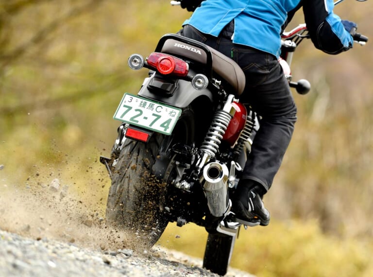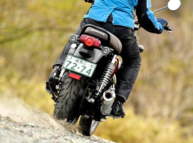 このバイクのベースとなったハイネスCB350が製造販売されているインドでは(国内仕様のGB350は熊本製作所で最終組み立て)、ダートを走る機会も多いはず。日本では、このバイクで未舗装路を走ることはまずないだろうが、もしもそういうシーンに遭遇しても、安定感の高さはプラスとして寄与する。ただし、前後サスはややハードにセットされている。
