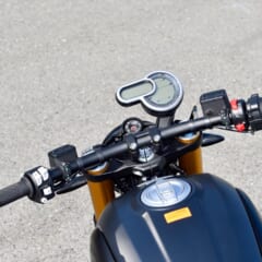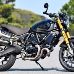 ドゥカティ スクランブラーの最大排気量モデル=1100シリーズは、トラクションコントロール/ライディングモード切り替えといった1100ならではの電子制御装備と、排気量から来る野太いトルクフィーリングがその持ち味。’21年はカテゴライズが刷新され、オーリンズ製前後サスペンションを備える最上位機種が「1100スポーツプロ」となり、バーエンドミラー装備の一文字ハンドルがそのアイコンになっている。