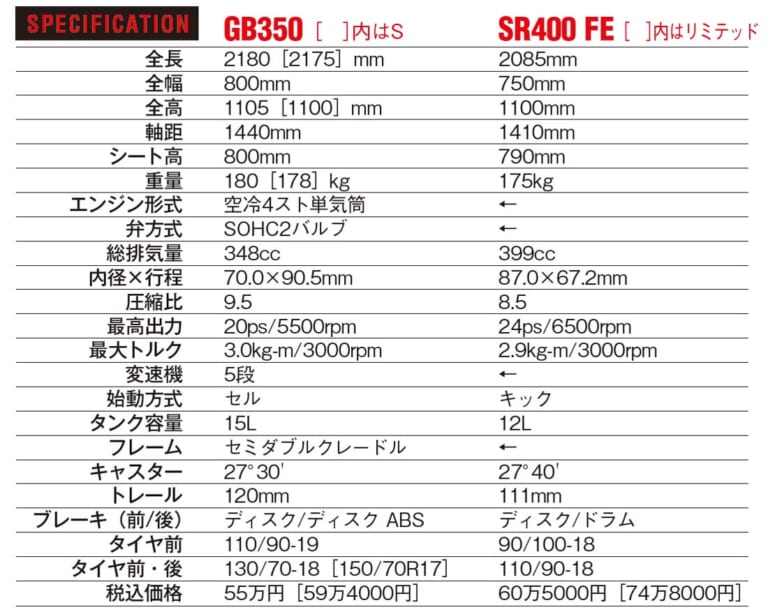 【SR400:コンパクトで車重も5kg軽い】寸法はやや小さく、特に全幅が50mm狭い。F19のGBに対し、前後18インチを履き、最低地上高もGBより36mm低い。ABS非装備もあって車重は5kg軽量だ。
